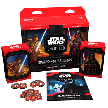 Star Wars - Spark of Rebellion - Two-Player Starter$34.990Set: Spark of Rebellion Sealed Release Date: 2024-03-08 ¡Entra a una galaxia de infinitas posibilidades en Star Wars™: Unlimited! En este fácil y rápido juego de cartas coleccionables, ...